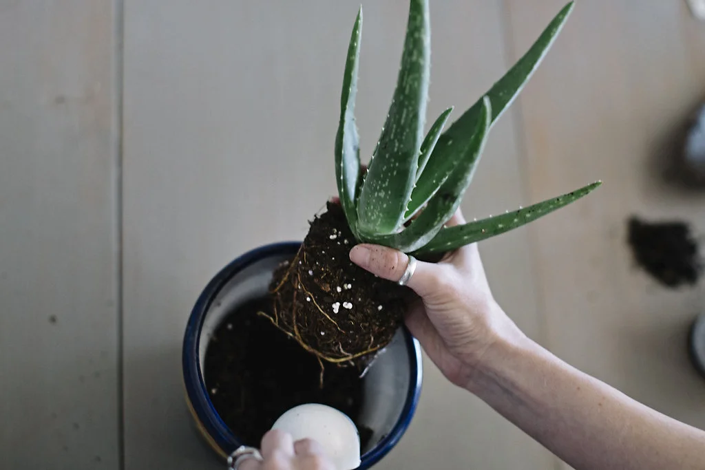 Step Five: Dig a little hole in your soil and begin placing the plant in it's new pot. Then, pour some dirt on top and firmly pat the dirt with your hands all the way around the plant until the new dirt and the dirt from your plant are leveled out evenly.